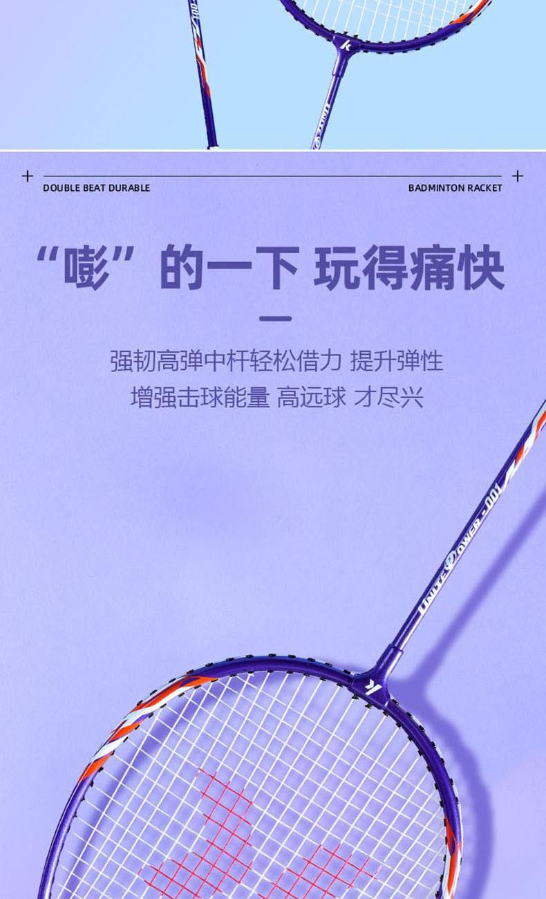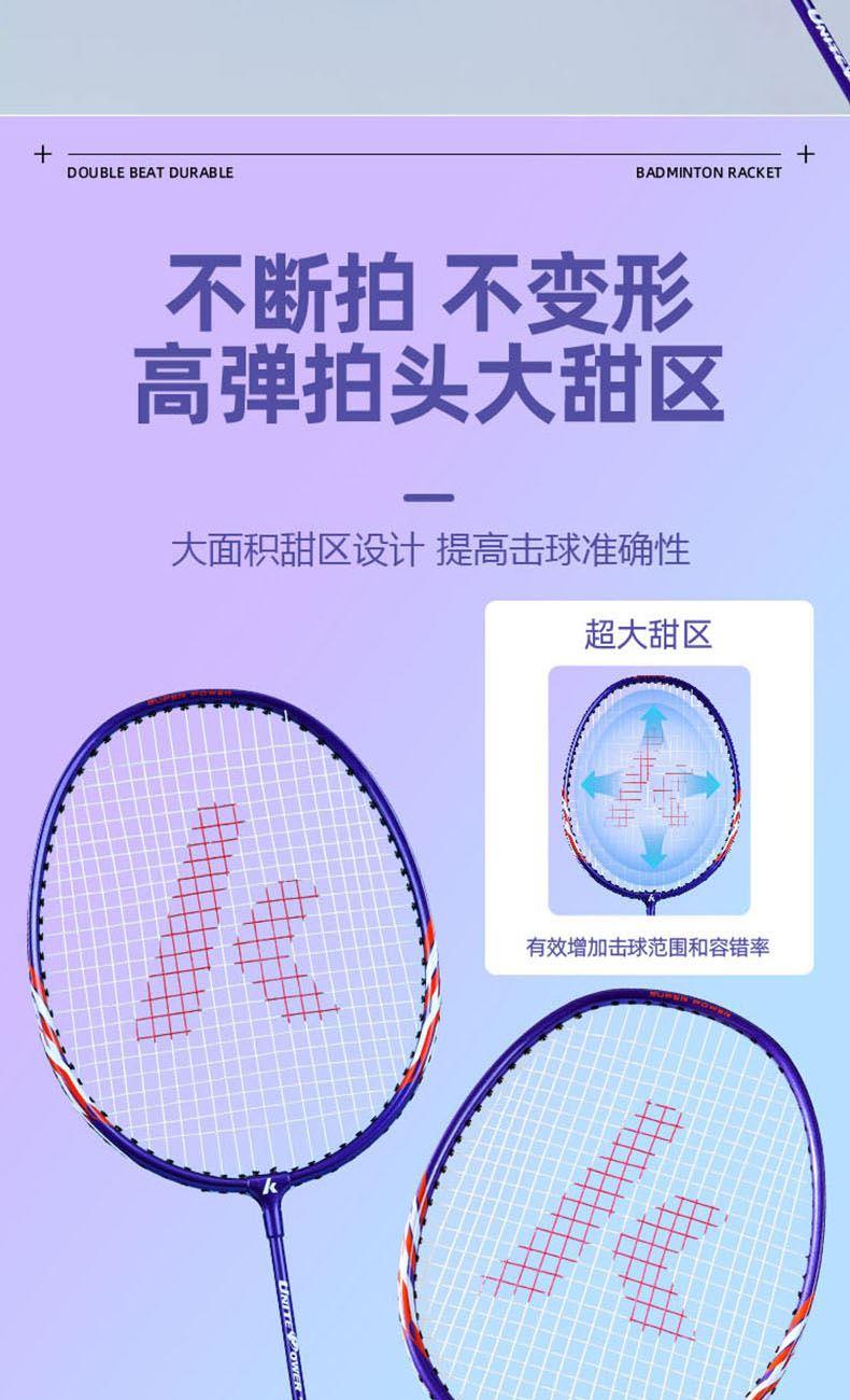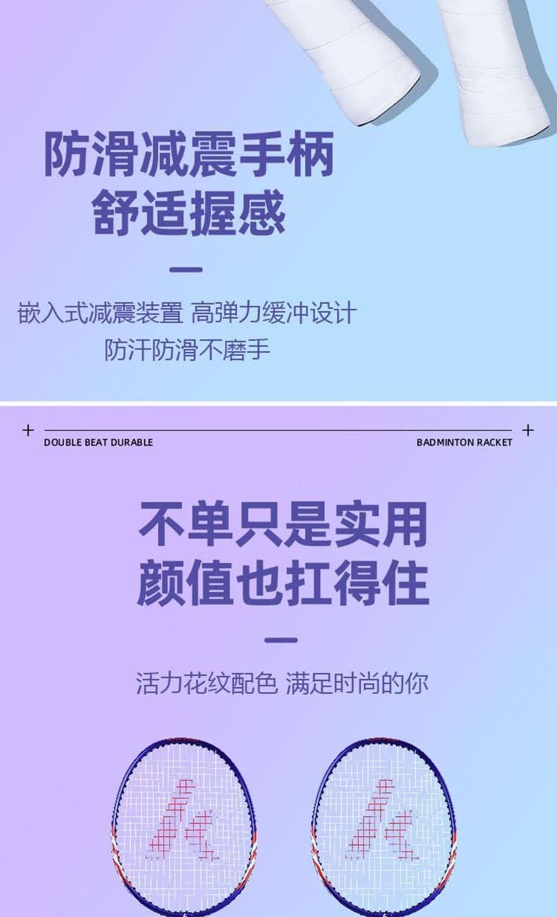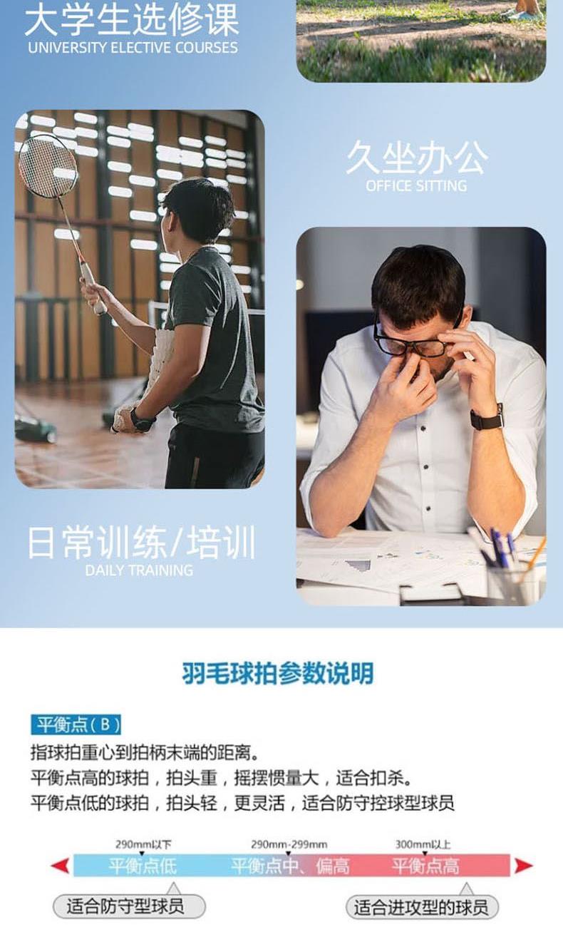 材質(zhì):拍框/拍桿:鋁合金 柄皮:聚氨酯 長度:675±1mm 產(chǎn)品尺寸:71*2*23cm 包裝尺寸:75cm*7cm*27cm 羽毛球拍*2 羽毛球拍拍套*1 9A超級耐打球*3 運(yùn)動護(hù)腕*1 運(yùn)動浴巾*1 髕骨帶*1 彈力帶*1 頭帶*1 運(yùn)動中襪*1 黃色禮盒*1 1.入門級推薦,攻守兩用,耐打,易上手 2.高科技拍框,手感輕盈,高磅拉力不變形 3.一體成型技術(shù)接頭,更好的控制球拍 4.高彈性中桿,韌性強(qiáng)勁有力,反彈更省臂力 5.舒適防滑手柄,手感舒適不震手,吸汗防滑