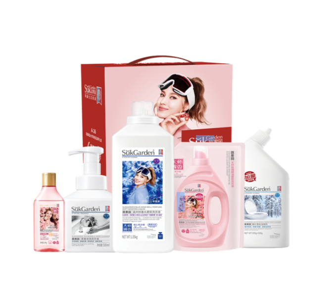 SukGarden蔬果園藍(lán)風(fēng)鈴香水柔軟洗衣液*1.05kg*1 SukGarden蔬果園銀針雪松潔廁劑*800g*1 SukGarden蔬果園茶香泡泡洗手液*500ml*1 SukGarden蔬果園天然玫瑰精油香氛洗衣液(袋裝)*500g*1 SukGarden蔬果園維多利亞玫瑰精油香氛內(nèi)衣洗衣液*200g*1 蔬果園大師調(diào)香品 牌通用禮盒(A-26)-彩箱*250*125*295mm*1