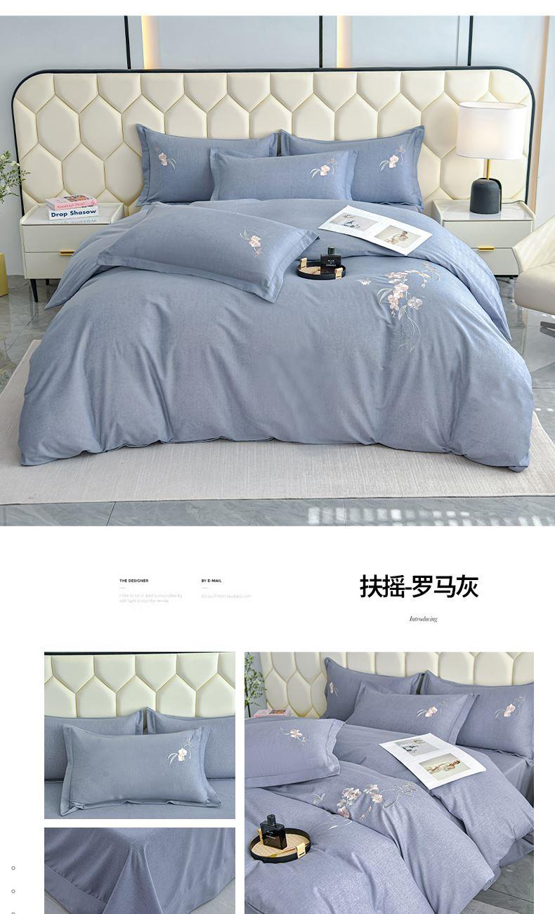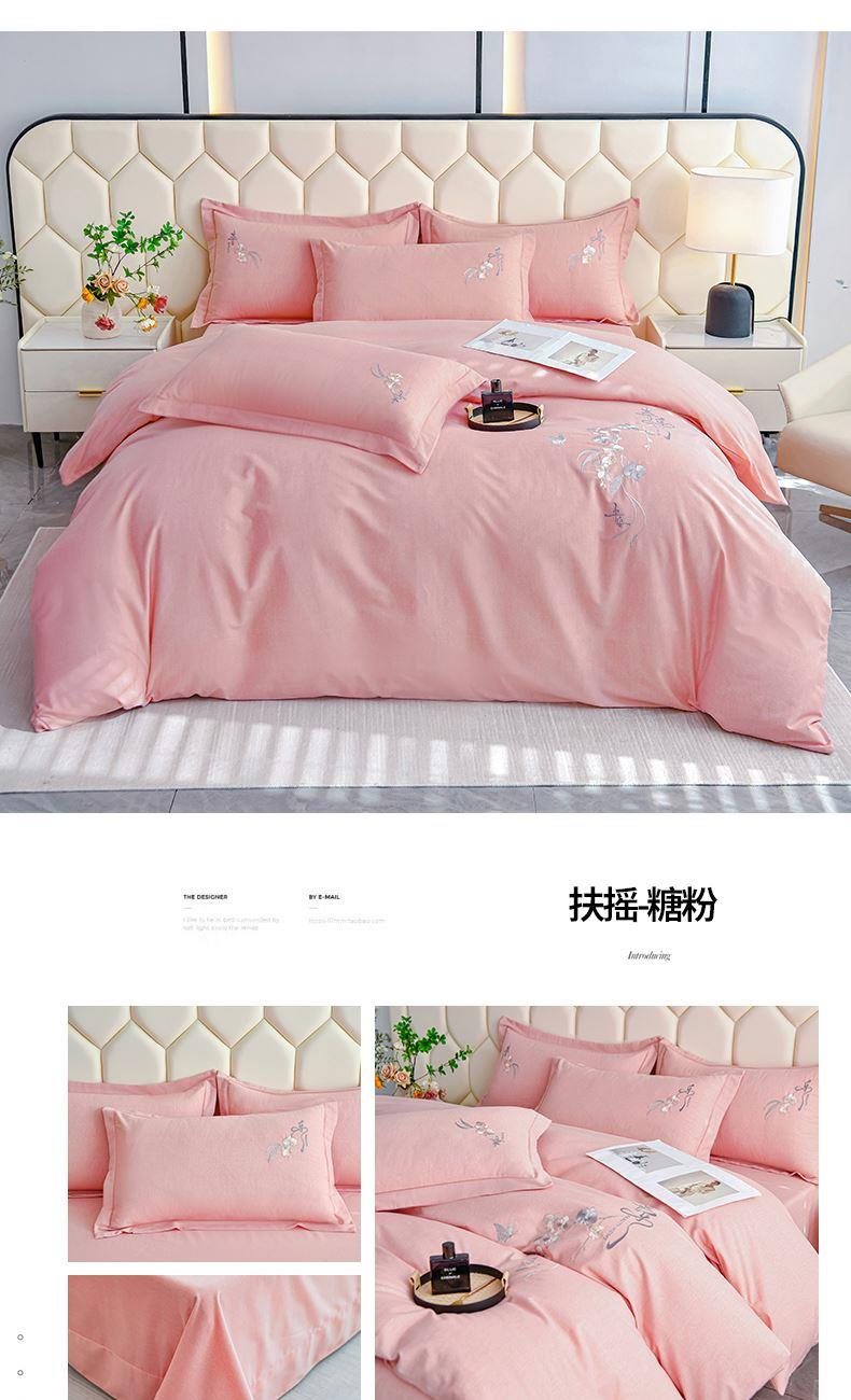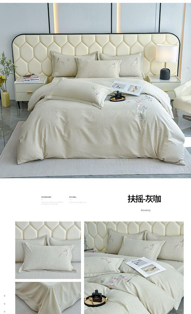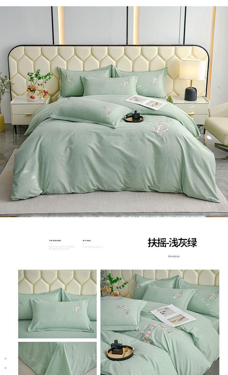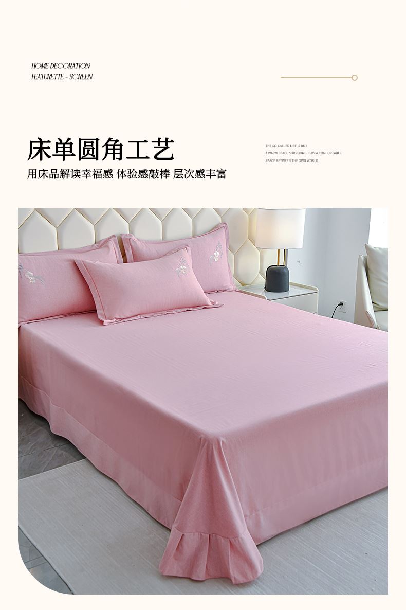 規(guī)格:1.5-1.8米床適用 被套200*230 床單245*250 枕套48*74 面料:棉 工藝:圓角床單+磨毛 花色:星空藍、糖粉、淺灰綠、羅馬灰、灰咖、紅豆沙、淡雅紫 1.全棉的面料經過磨毛工藝后,在表面形成一層短毛絨,面料柔軟豐盈,又增加了保暖性 2.細膩繡花工藝,針腳細膩均勻,不易脫線 手感細膩凹凸有致。 3.精致做工,吊邊床單設計 懸垂性好 便于打理 ,荷葉吊邊 美觀時尚 層次感強。