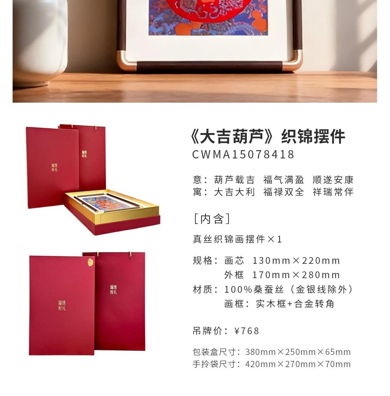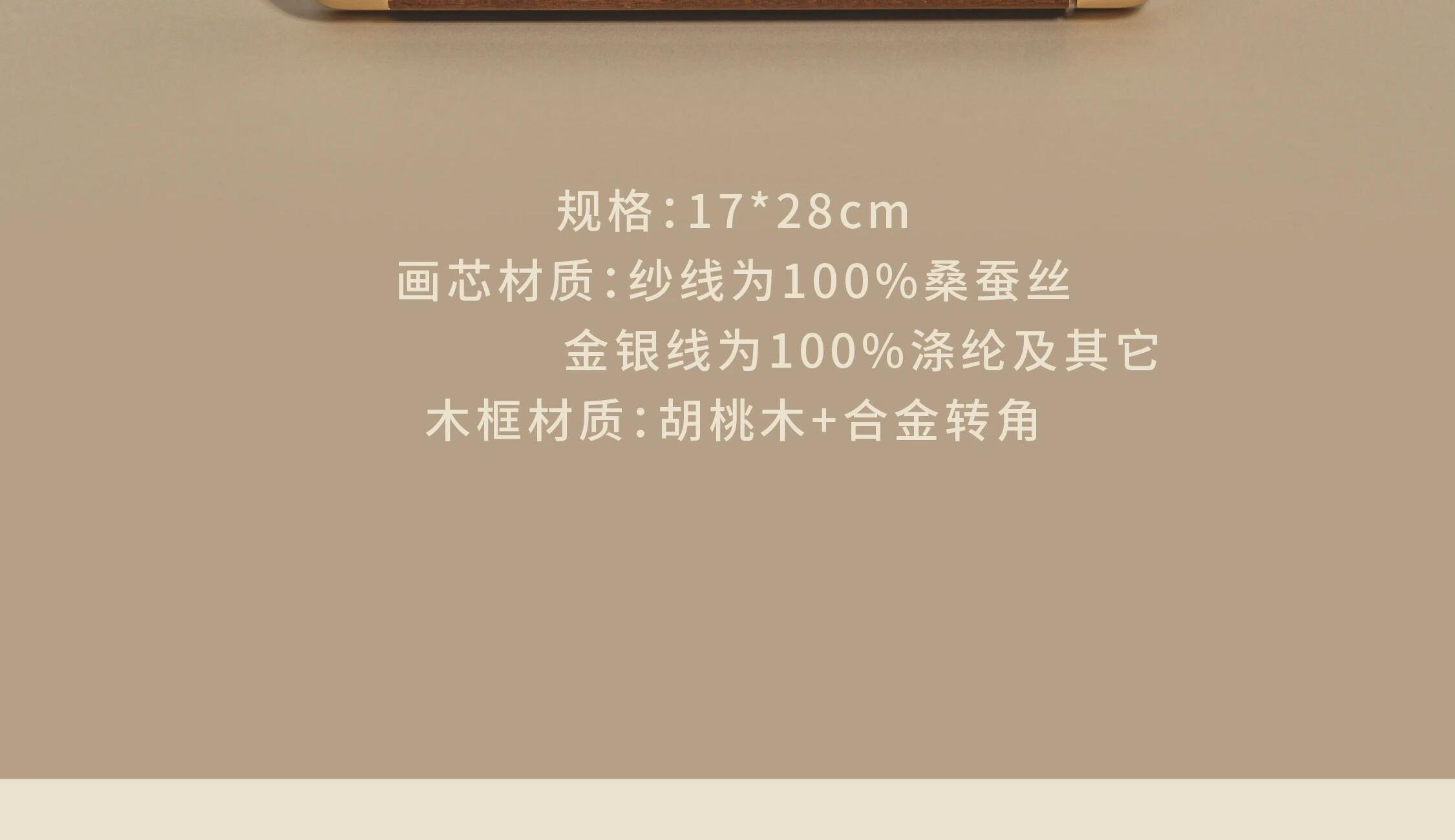 [內(nèi)含] 真絲織錦畫擺件 Ⅹ 1 規(guī)格:畫芯130mm×220mm 外框170mm×280mm 材質(zhì):100%桑蠶絲(金銀線除外) 畫框:實(shí)木框+合金轉(zhuǎn)角 包裝盒尺寸:380mm×250mm×65mm 手拎袋尺寸:420mm×270mm×70mm