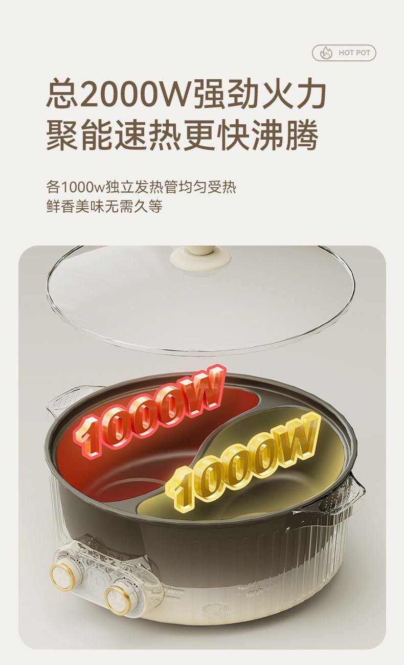 功率:2000W 電壓:220V 容量:5L 毛重:2.5Kg 材質(zhì):外殼PP+食品級不粘水性涂層 彩盒包裝尺寸:351*200*352mm 外箱包裝尺寸:712*410*365mm 推薦理由: 1、5升大容量,滿足全家所需 2、雙開關分區(qū)獨立控溫,單獨運作互不干擾 3、不粘鍋內(nèi)膽,清洗好方便 4、2000W大火力,更快沸騰更方便 5、全新升級,獨立發(fā)熱盤 6、自動控溫檢測,防干燒保護