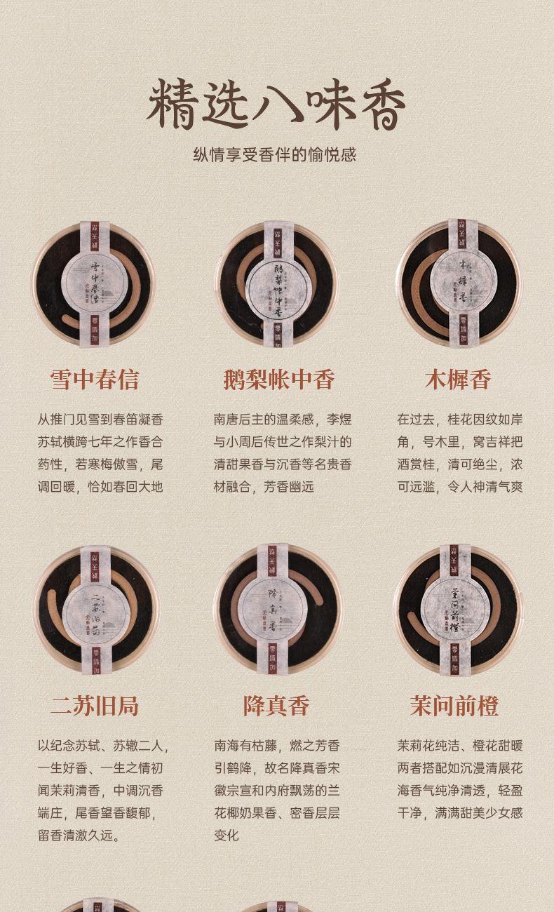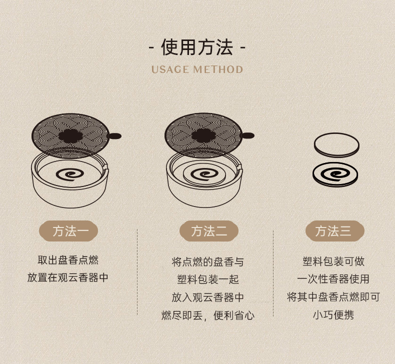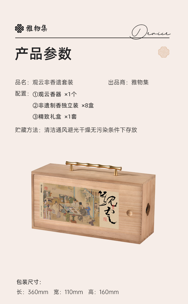 配置 · ① 觀云·盤香器×1套 ② 中式盤香·獨(dú)立裝×8盤 ③ 竹枝提梁木匣×1套