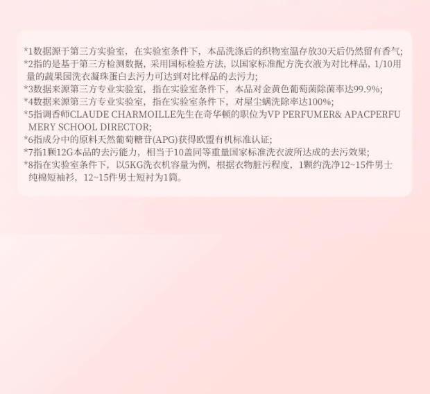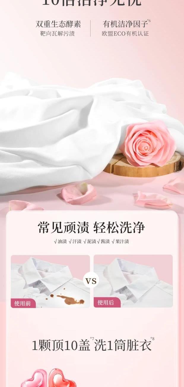規(guī)格:10g*6顆 格拉斯玫瑰香氛洗衣凝珠,液體留香珠,顛覆傳統(tǒng)香氛體驗(yàn) 10g大容量,10倍濃縮潔凈,一顆可洗8-12件衣物 護(hù)色固色,保護(hù)衣物本色 柔順防靜電,呵護(hù)每一寸肌膚