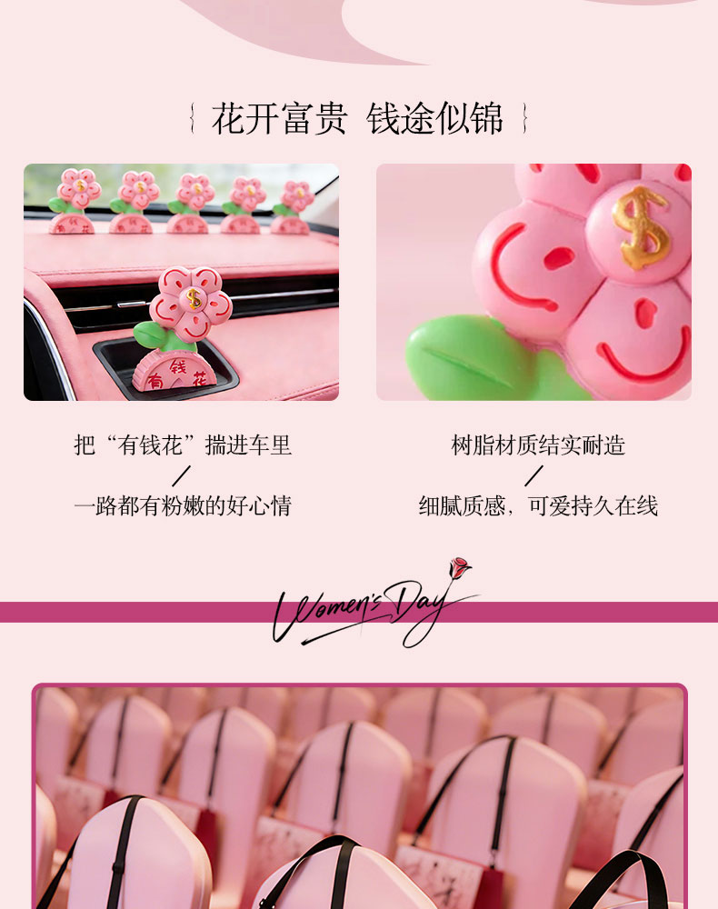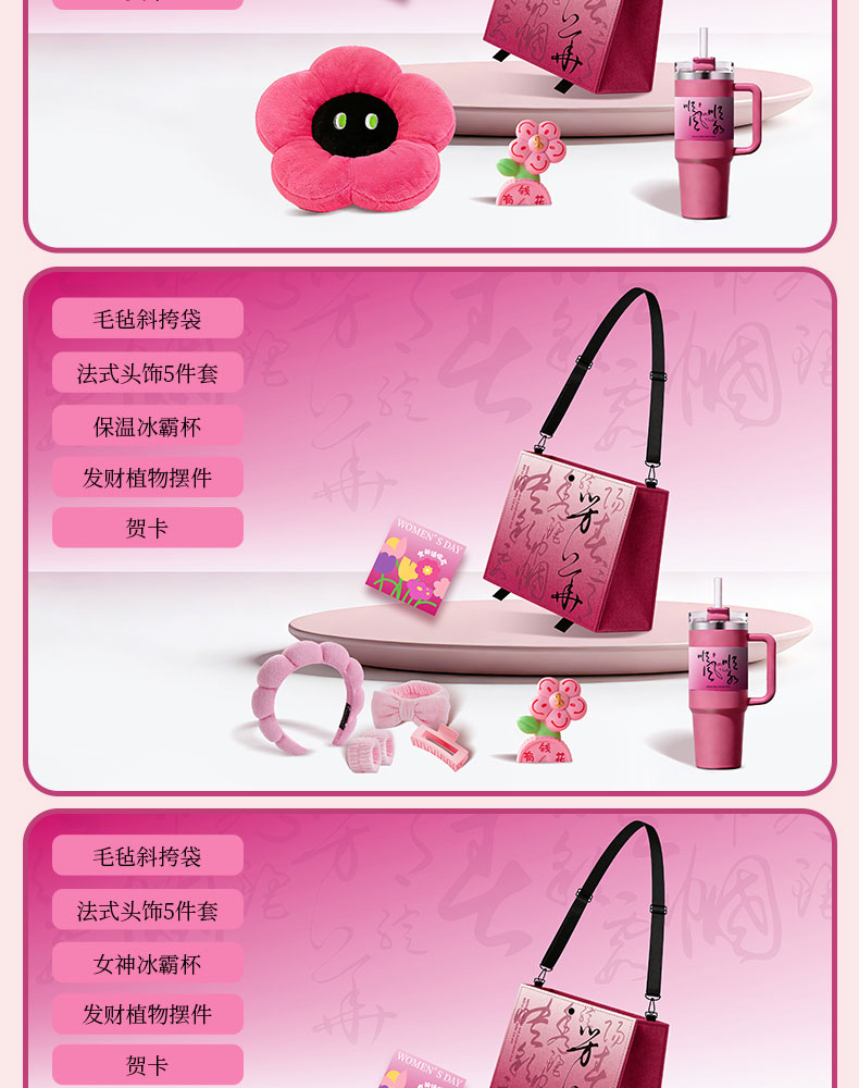 1.毛氈斜挎袋 2.多巴胺花朵抱枕 3.保溫冰霸杯 4.發(fā)財植物擺件 5.賀卡