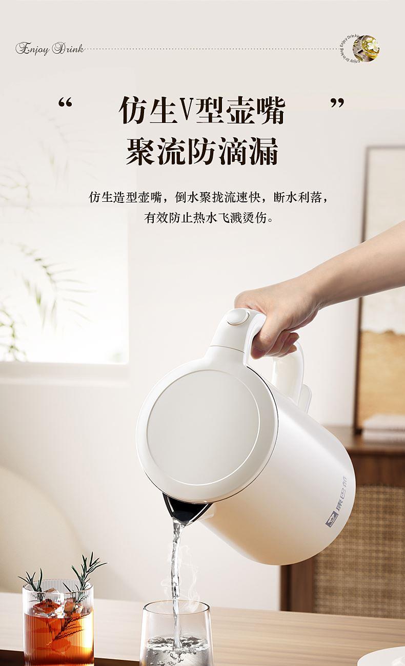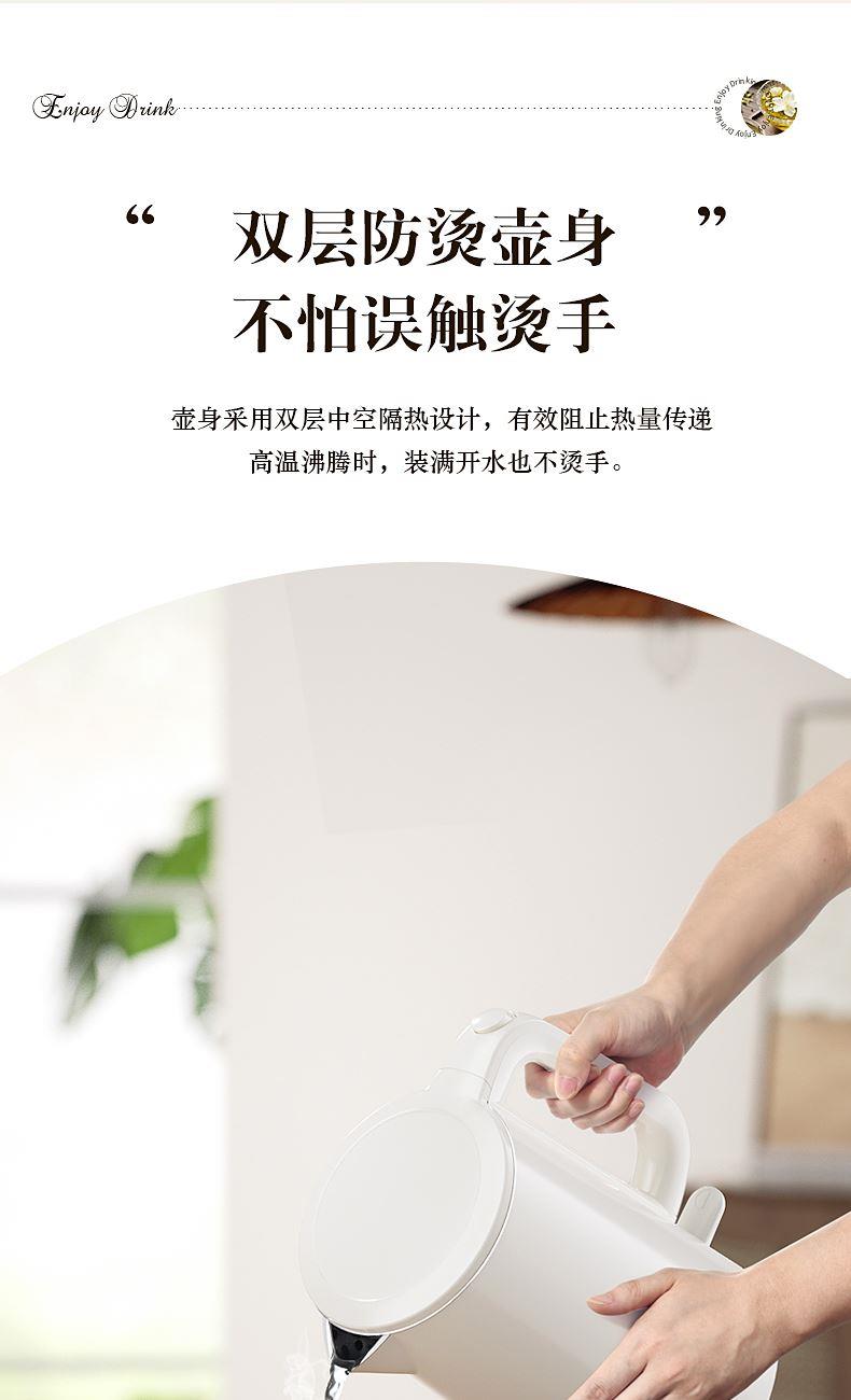 ◎雙層隔熱壺身,貼心防燙,安心使用。外殼與內(nèi)膽間形成中空隔熱層,壺內(nèi)水沸騰,壺外不燙手;