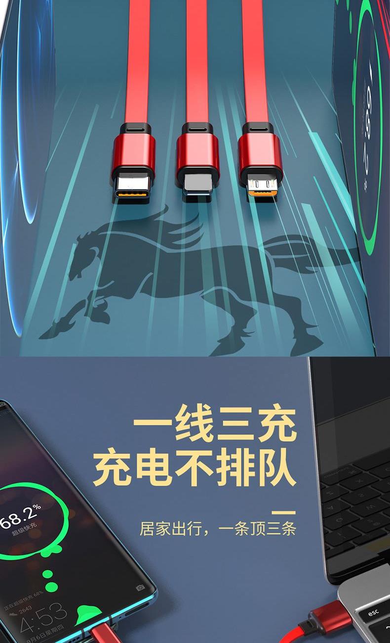 ● 66W-100W快充:提供高效的充電體驗(yàn) ● 一線三充:支持三臺(tái)手機(jī)同時(shí)充電 ● 伸縮設(shè)計(jì):五個(gè)檔位可調(diào)節(jié) ● 加粗線芯:保護(hù)設(shè)備安全 ● 小巧易收納:攜帶方便 告別凌亂