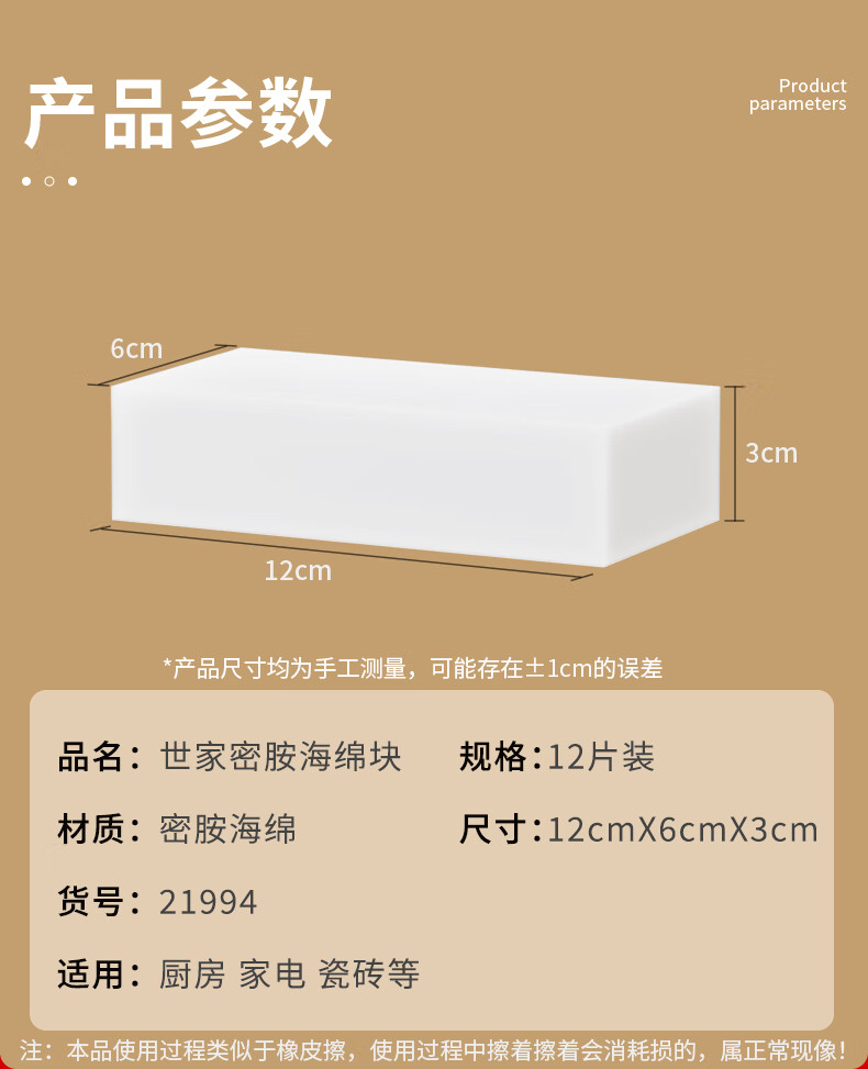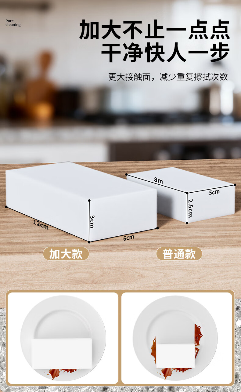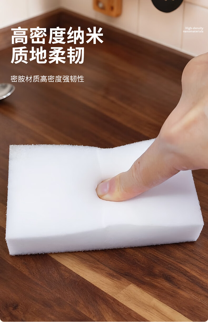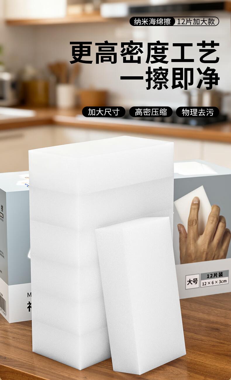 材質(zhì):密胺海綿 尺寸:12cmX6cmX3cm 貨號:21994 適用:廚房 家電 瓷磚等 納米海綿擦 12片加大款 更高密度工藝一擦即凈 加大尺寸 高密壓縮 物理去污